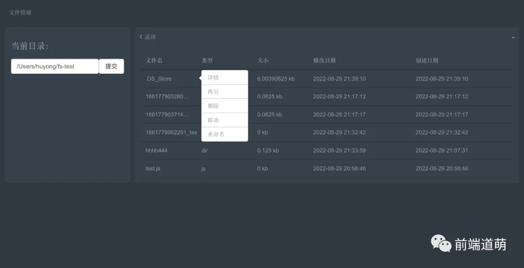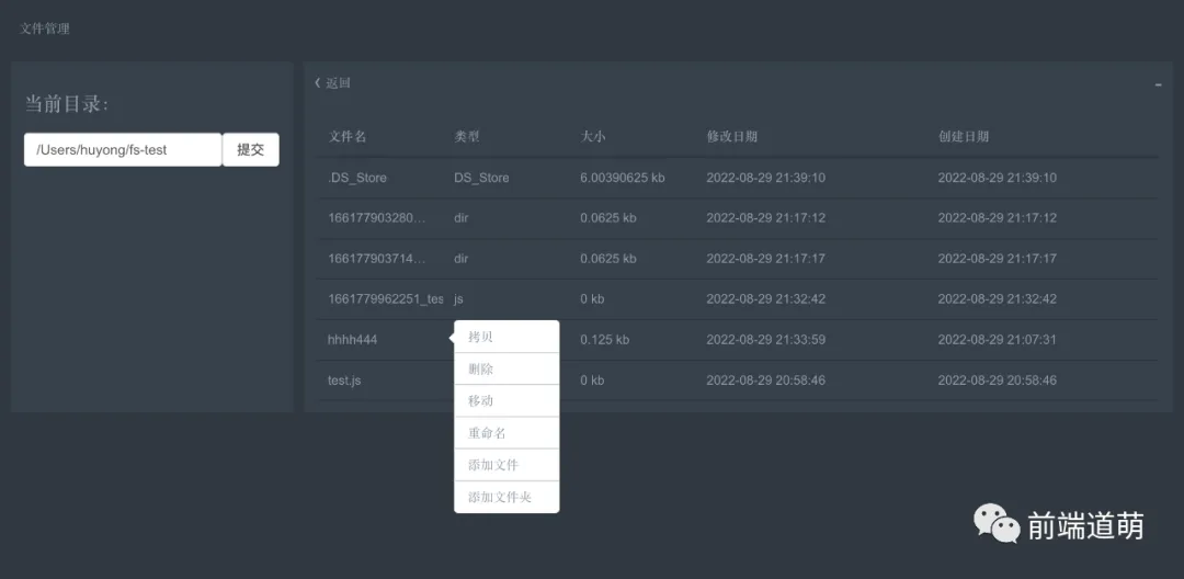 该示例是基于nodejs的一套UI可视化文件管理系统,提供一些常用文件(夹)操作,包含文件(夹)读取、创建、拷贝、移动、删除、重命名。