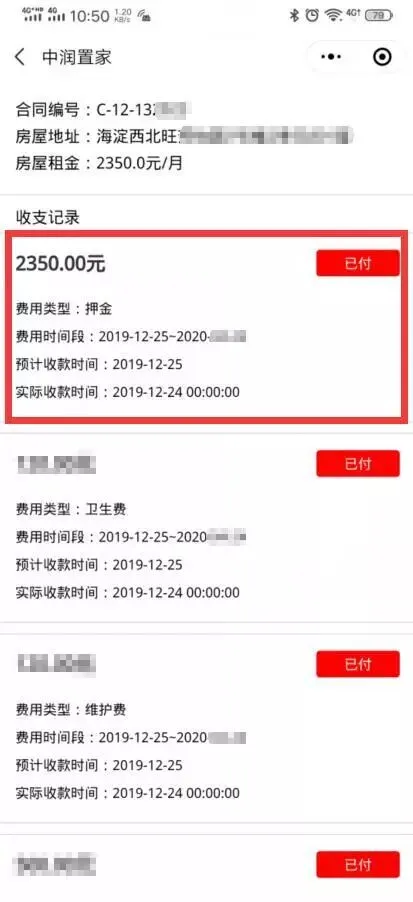5、点击【房屋地址】可查看收支记录,会显示定金、押金、房租、卫生费、维护费等缴费记录;