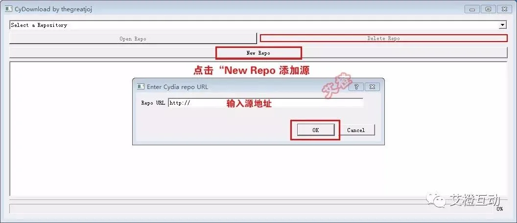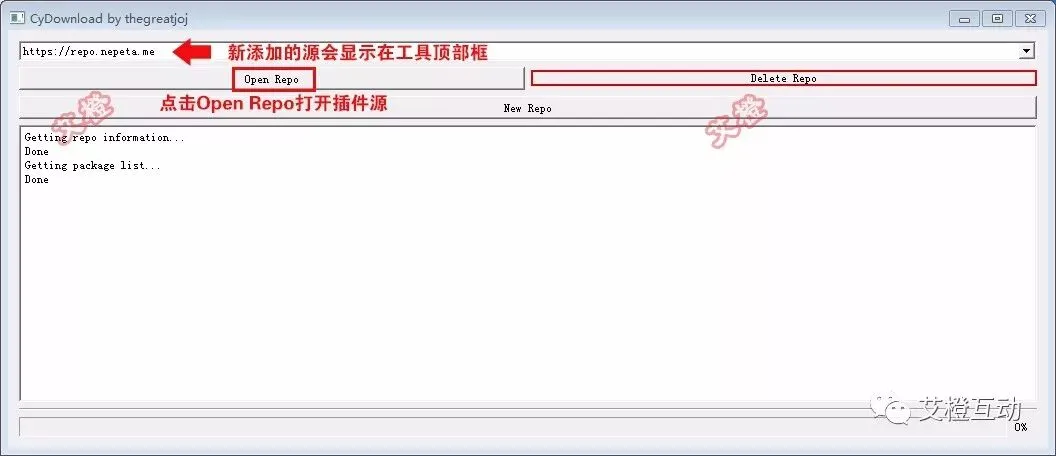 打开工具Cydownload 后,点击New Repo 添加插件源,这里我们以Nepeta 源为例。
