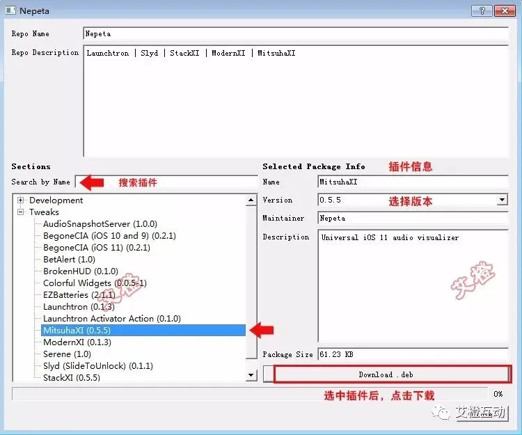 等待加载后,会弹出一个新窗口,可以看到源内所有插件。可以在源列表内寻找要下载的插件,选中后点击右边「Download.deb」就可以下载该插件的deb文件,首次使用需要选保存位置。