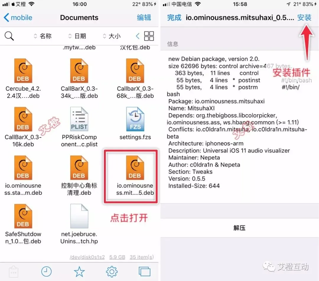 在Filza 内找到导入的插件,点击打开。然后点击右上角“安装”来安装插件。