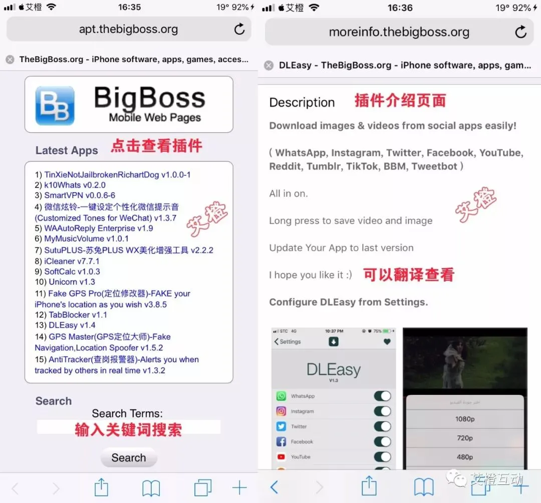我们可以通过BigBoss 网页,查看插件详细内容,支持搜索。可以在Safari 打开,通过网页翻译,更好的查看插件详细介绍。