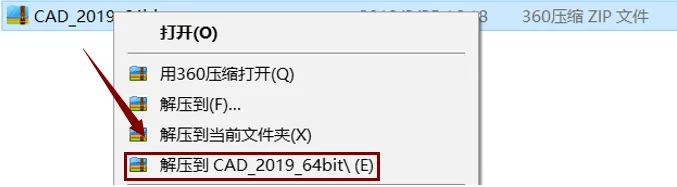 1. 关闭防火墙,鼠标右击软件压缩包,选择解压到“CAD_2019_64bit”。