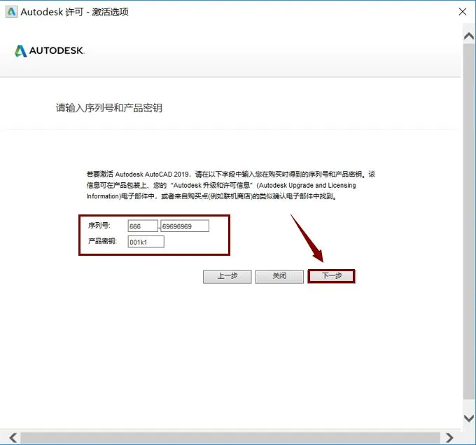 14. 输入序列号:666-69696969 产品密钥:001k1,然后点击“下一步”。