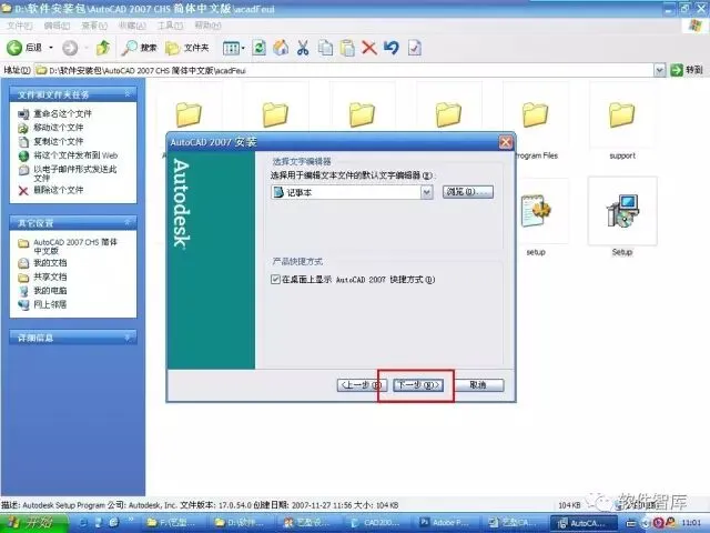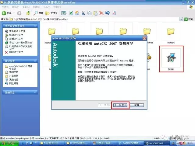 1.使用“百度云客户端”下载AutoCAD2007软件安装包并解压,在安装文件找到“Setup.exe”,选中右击选择【以管理员身份运行】,进入软件安装界面,点击【下一步】