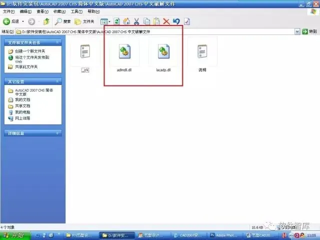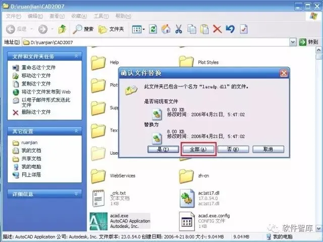 12.下面开始破解,将破解文件中两个破解文件(adlmdll.dll和lacadp.dll)复制粘贴到安装路径下,默认路径:C:\ProgramFiles\AutoCAD 2007,然后点击【全部】