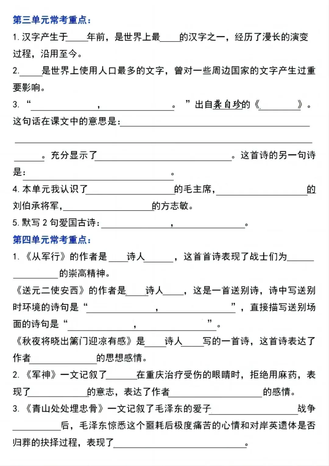 【高清电子版】五年级下语文1-8单元常考重点内容填空