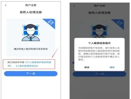 第三步、进入个人协议签订页面,阅读《个人信息保护告知同意书》《人脸服务协议》,签订成功后点击“下一步”。
