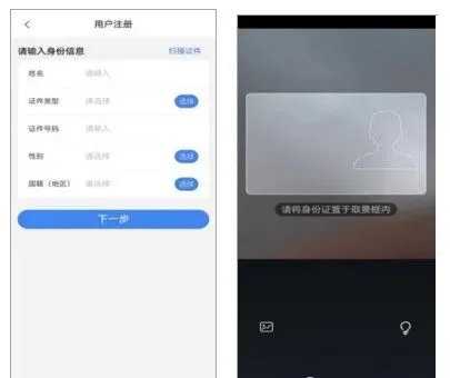 第四步、进入身份信息采集页面。身份信息采集可以通过手动输入姓名、证件类型、证件号码、性别、国籍等信息或通过点击右上角“扫描证件”,进入证件扫描界面,按提示进行证件扫描。