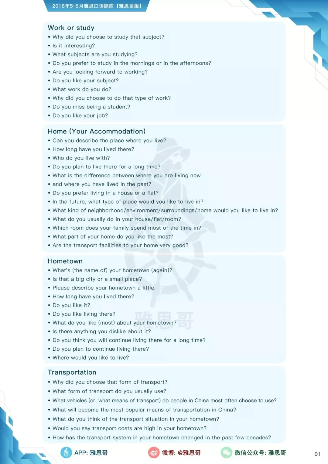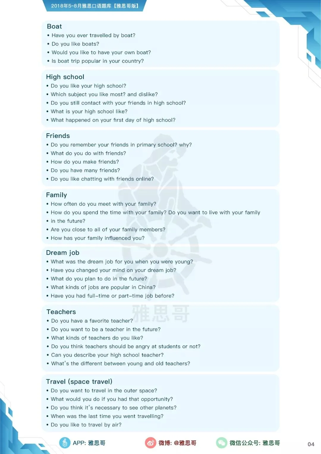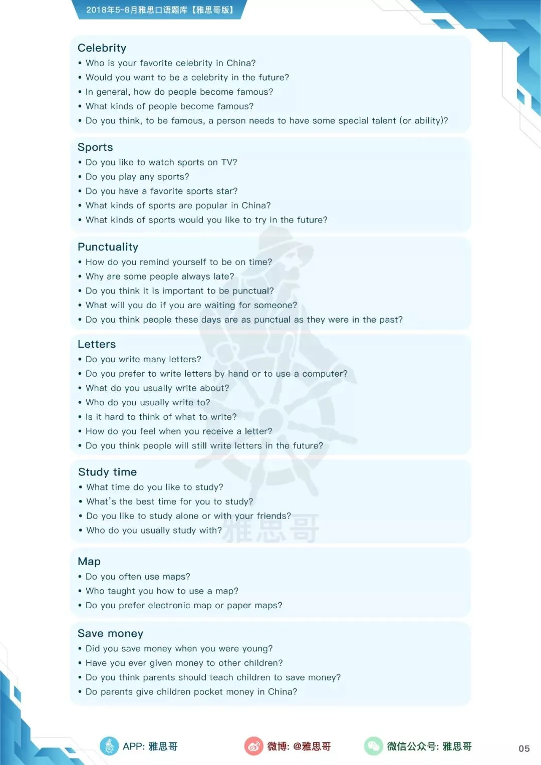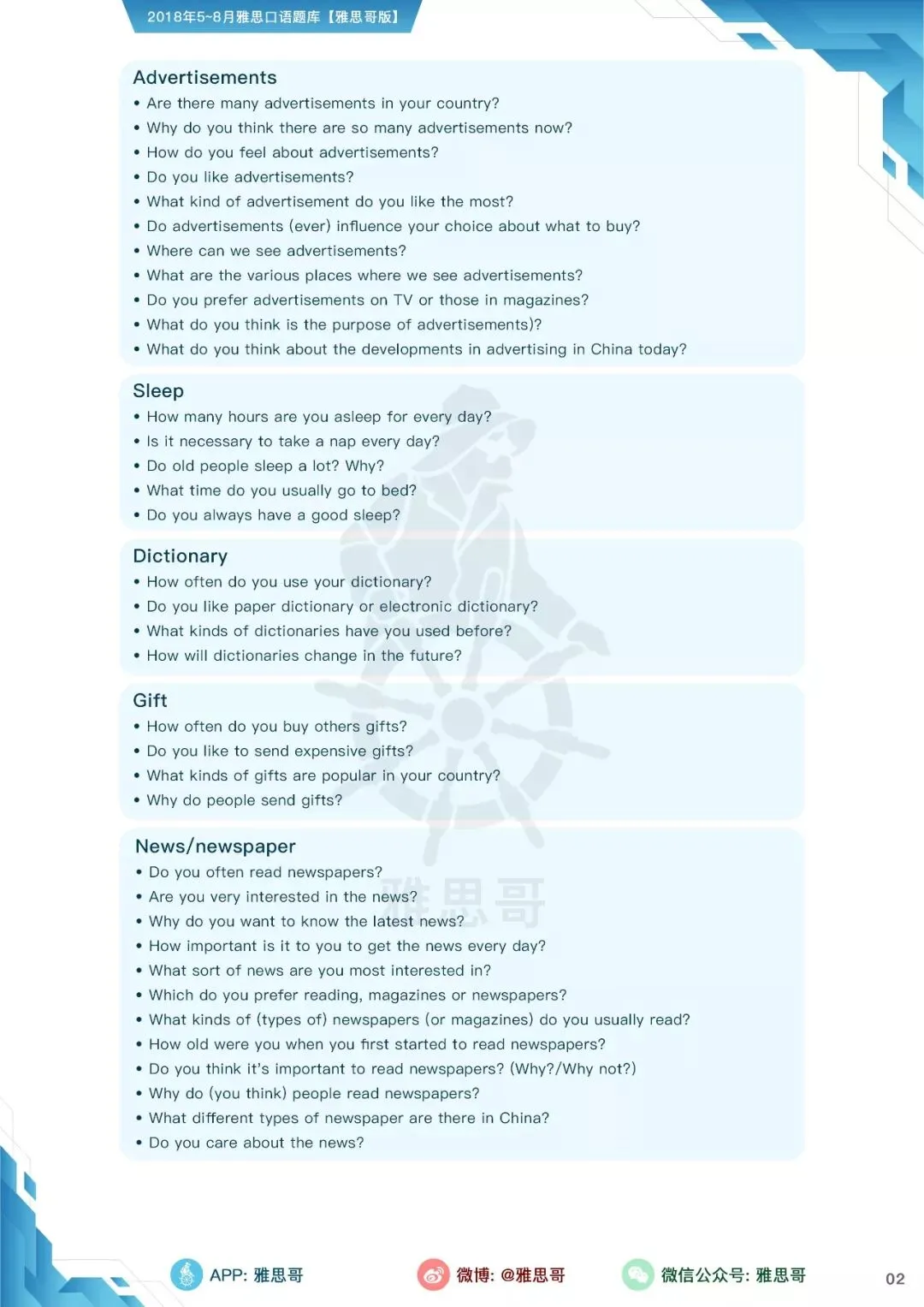 【独家】5-8月完整口语题卡发布!可打印PDF版!