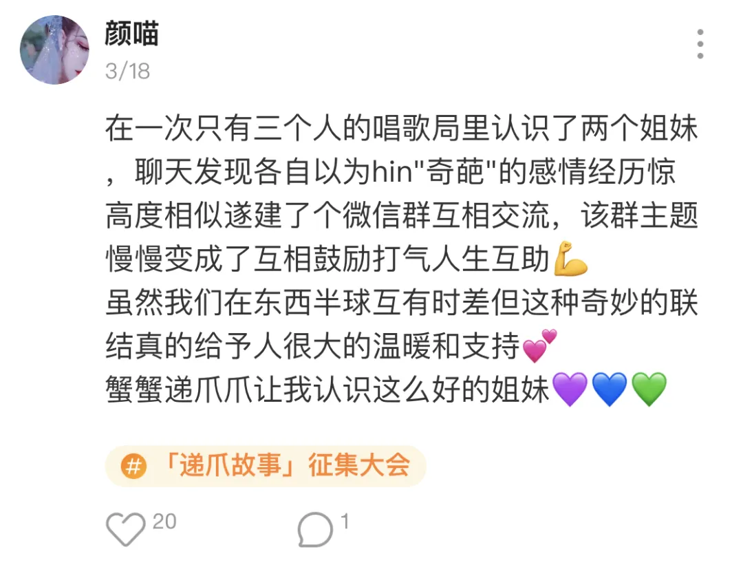 不夸张地说,玩递爪的这几个月,是我社交圈飞速扩张的几个月。我认识了一群很可爱的女孩子,终于感受到了有闺蜜群的快乐,和这些活泼开朗笑嘻嘻的女孩子在一起,我也变得开朗的许多,说话也硬气了,很喜欢这样的自己。