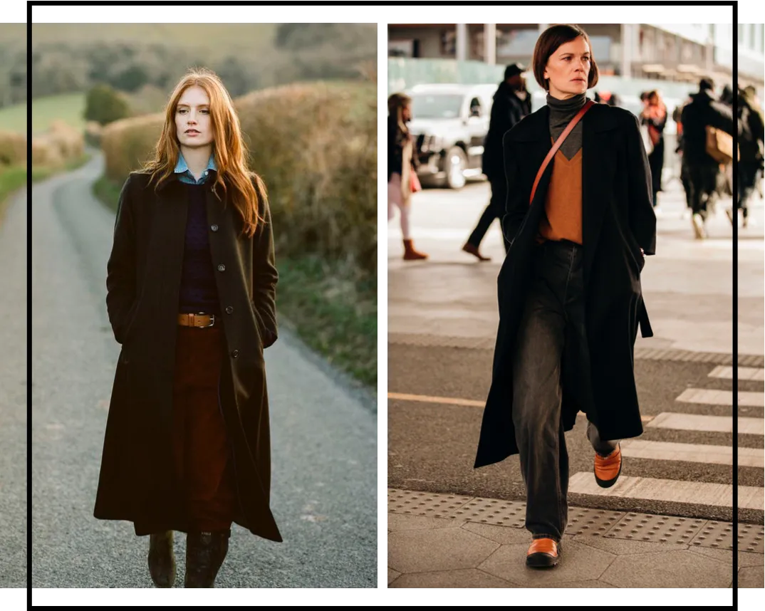 垂坠感强的羊毛大衣,敞开衣扣,走起路来又飒又带风。搭配明艳的棕黄色可以打破沉闷。
