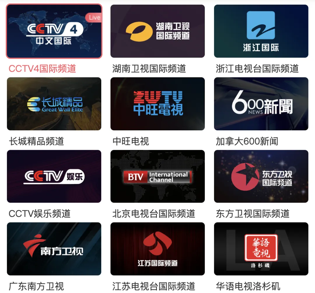 不仅有CCTV-国际、湖南国际、广东南方卫视、北京国际、江苏国际等北美最全中文电视台直播,同样全、快、不需要另外付费!就算错过了某档节目,也可以从该台回看列表里找到,点击后就可以轻松回看。