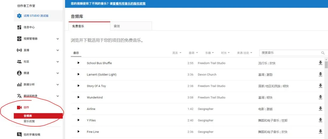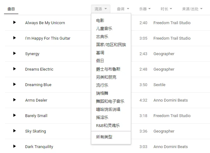 YouTube 音频库有大量的音乐和音效素材,类型丰富,时长不限,品质高到令人发指,且全员 mp3。