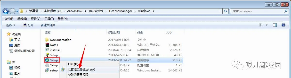 2.打开“ArcGIS10.2\10.2软件包\LicenseManager\windows”文件夹,鼠标右击“Setup”,选择“以管理员身份运行”