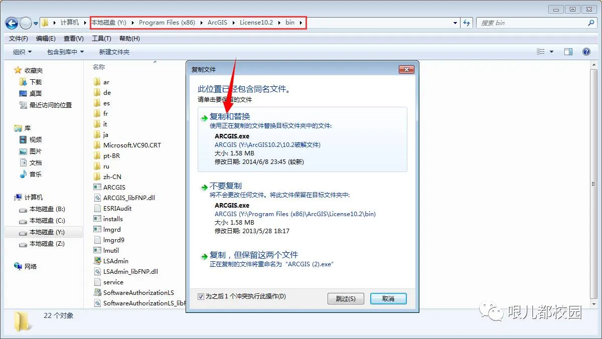13.打开安装路径(默认为 C:\Program Files (x86)\ArcGIS\License10.2)下的“bin”文件夹,粘贴替换刚刚复制的两个文件;然后将“为之后 1 个冲突执行…”前面的复选框挑勾,再点击“复制和替换”
