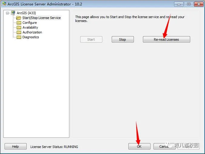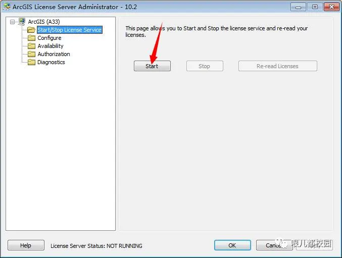 14.再回到“ArcGIS License Server Administrator – 10.2”界面,点击“Start”,启动许可服务