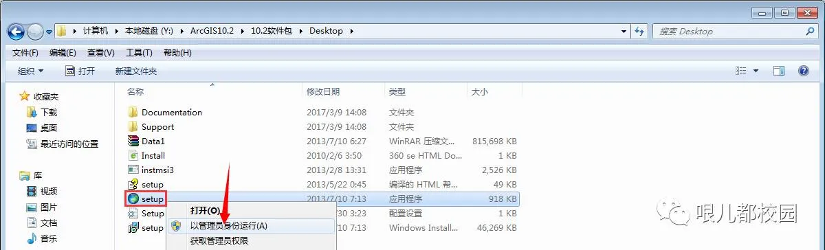 16.打开“ArcGIS10.2\10.2软件包\Desktop”文件夹,鼠标右击“setup”,选择“以管理员身份运行”