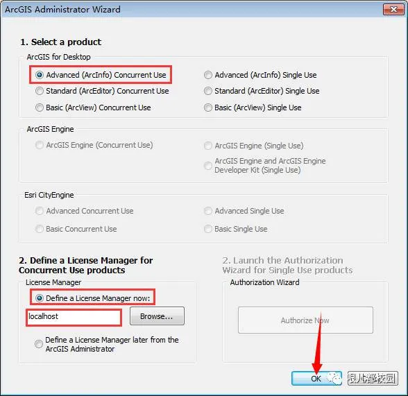 29.选择“Advanced(ArcInfo)Concurrent Use”,然后选择“Define a License Manager now:”,再将框中内容“Not_Set”修改为“localhost”,最后点击“确OK”