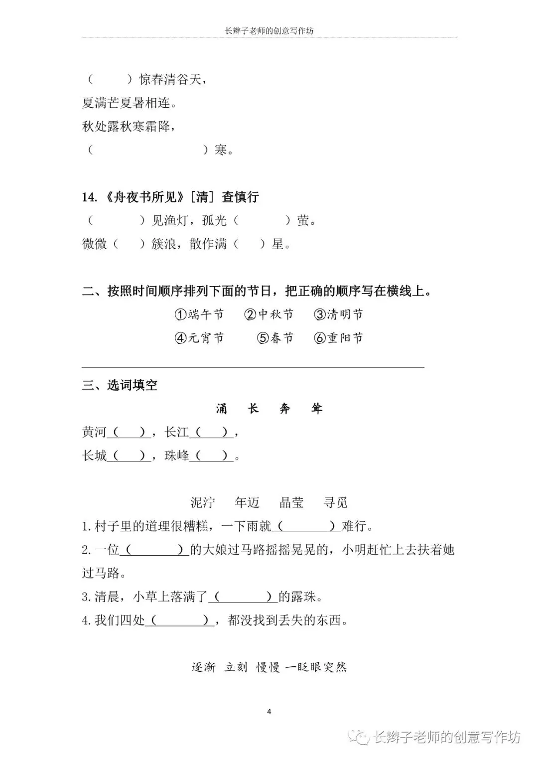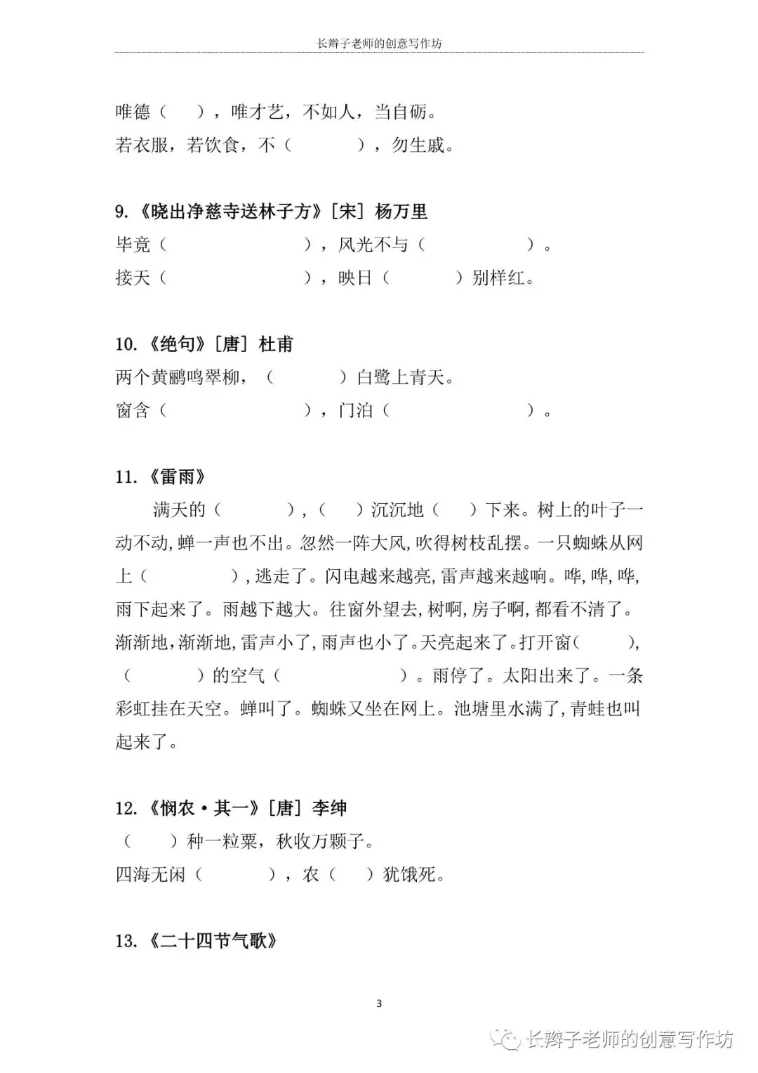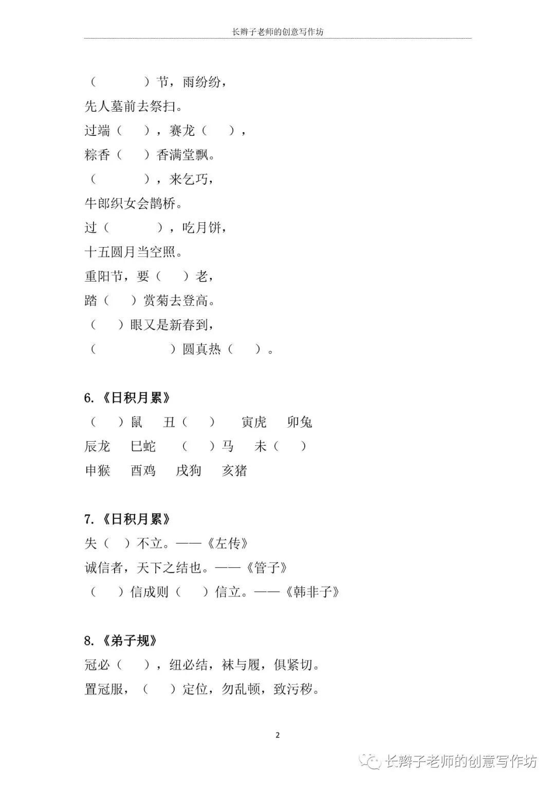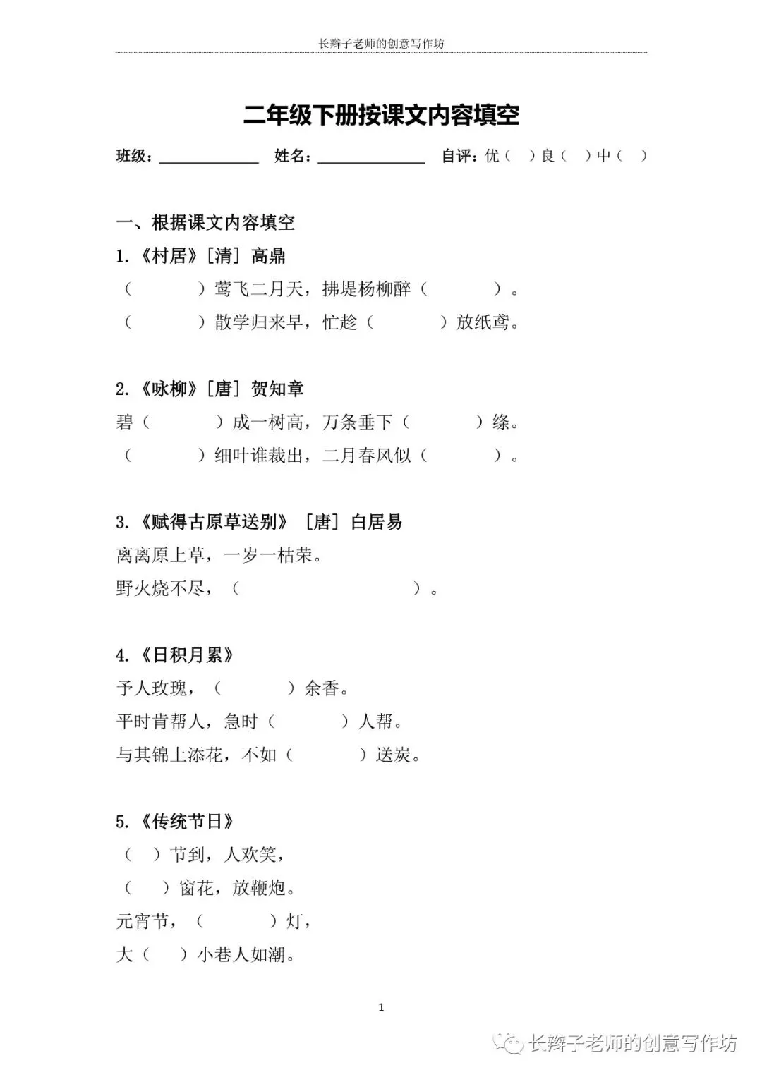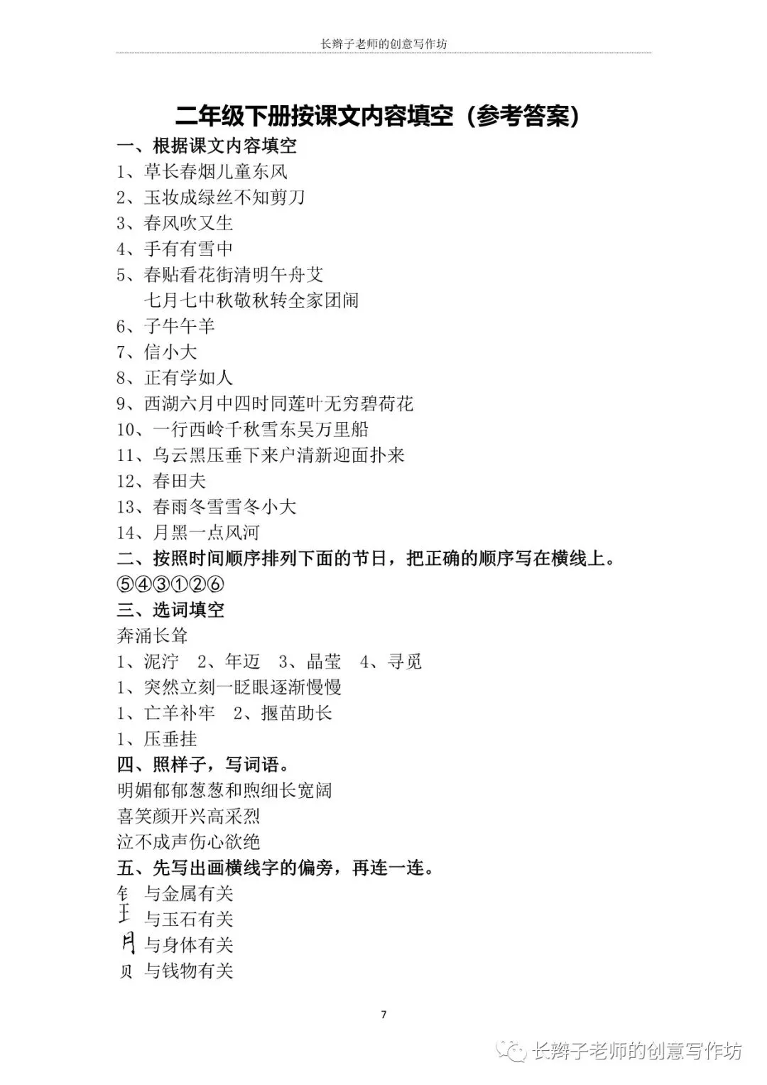 若需要“二下必背课文自测表”,请关注微信公众号“长辫子老师的创意写作坊”,在公众号首页对话框写——二下必背课文,便会自动弹出提取链接。