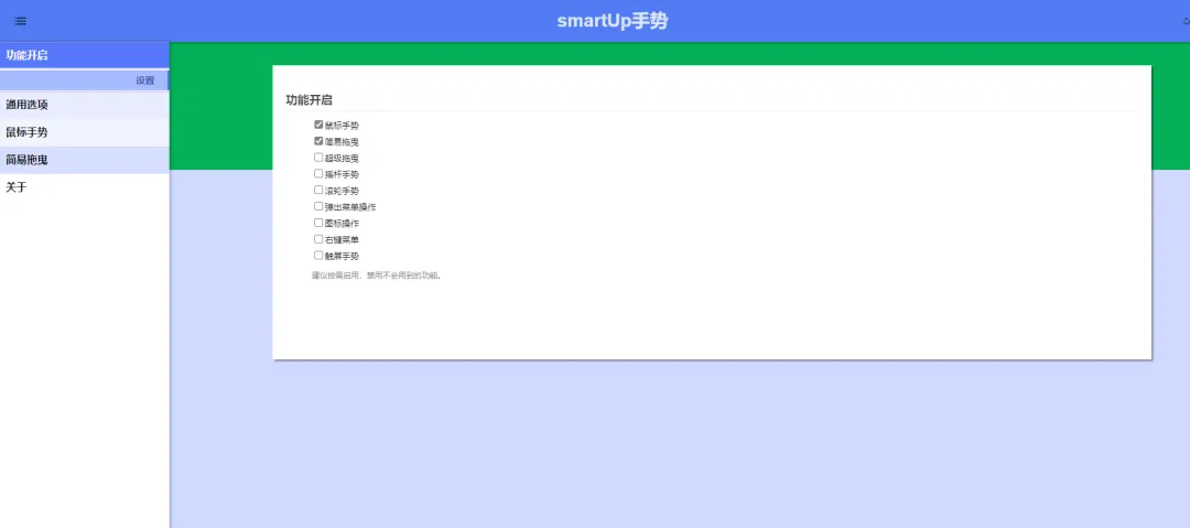 功能是挺丰富的,有鼠标手势、简易拖拽、超级拖拽、弹出菜单、右键菜单等等,这边也建议需要的功能才去启用。