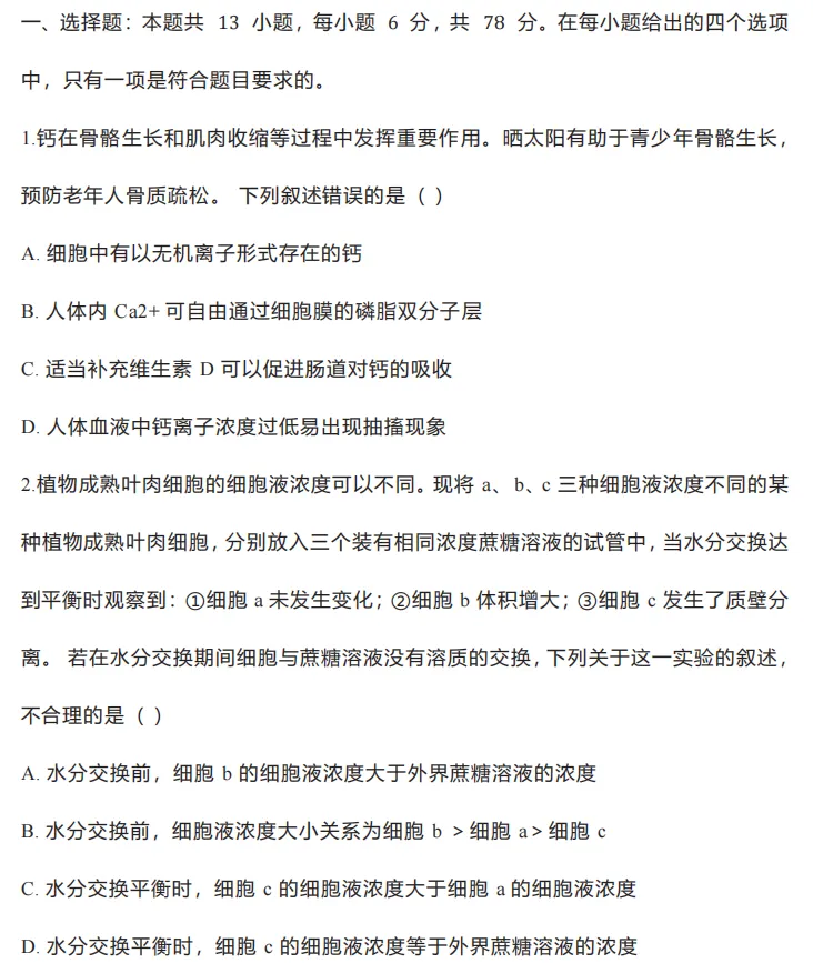2.植物成熟叶肉细胞的细胞液浓度可以不同。现将 a、 b、c 三种细胞液浓度不同的某种植物成熟叶肉细胞,分别放入三个装有相同浓度蔗糖溶液的试管中,当水分交换达到平衡时观察到:①细胞a 未发生变化;②细胞b 体积增大;③细胞 c 发生了质壁分离。若在水分交换期间细胞与蔗糖溶液没有溶质的交换,下列关于这一实验的叙述,不合理的是()
