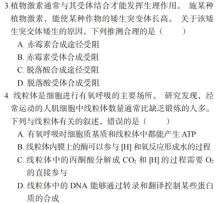 3.植物激素通常与其受体结合才能发挥生理作用。施某种植物激素,能使某种作物的矮生突变体长高。 关于该矮生突交体矮生的原因,下列推测合理的是()