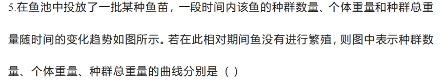 5.在鱼池中投放了一批某种鱼苗,一段时间内该鱼的种群数量、个体重量和种群总重量随时间的变化趋势如图所示。若在此相对期间鱼没有进行繁殖,则图中表示种群数量、个体重量、种群总重量的曲线分别是()