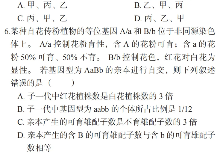 6.某种自花传粉植物的等位基因 A/a 和 B/b 位于非同源染色体上。A/a 控制花粉育性,含 A 的花粉可育;含 a 的花粉 50% 可育、50% 不育。B/b 控制花色,红花对白花为显性。若基因型为 AaBb 的亲本进行自交,则下列叙述错误的是()