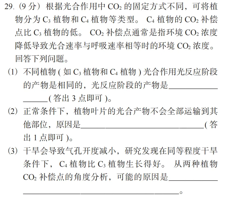 29. (9 分) 根据光合作用中 CO2 的固定方式不同,可将植物分为 C3 植物和 C4 植物等类型。C4 植物的 CO2 补偿点比 C3 植物的低。CO2 补偿点通常是指环境 CO2 浓度降低导致光合速率与呼吸速率相等时的环境 CO2 浓度。