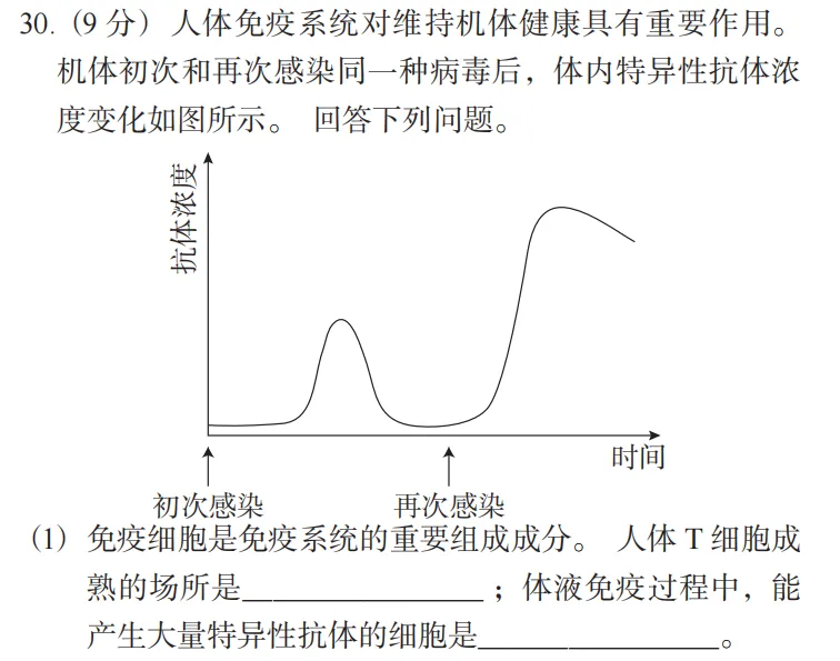 30. (9 分) 人体免疫系统对维持机体健康具有重要作用。机体初次和再次感染同一种病毒后,体内特异性抗体浓度变化如图所示。