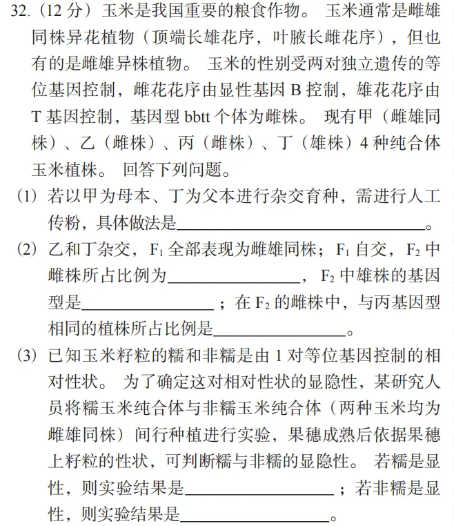 32. (12 分) 玉米是我国重要的粮食作物。玉米通常是雌雄同株异花植物(顶端长雄花序,叶腋长雌花序),但也有的是雌雄异株植物。玉米的性别受两对独立遗传的等位基因控制,雌花花序由显性基因 B 基控制,雄花花序由 T 基因控制,基因型 bbtt 个体为雌株。现有甲(雌雄同株)、乙(雌株)、丙(雌株)、丁(雄株)4 种纯合体玉米植株。回答下列问题。