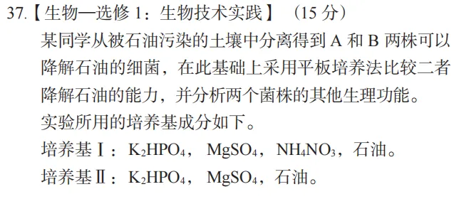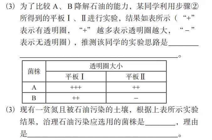 某同学从被石油污染的土壤中分离得到 A 和 B 两株可以降解石油的细菌,在此基础上采用平板培养法比较二者降解石油的能力,并分析两个菌株的其他生理功能。