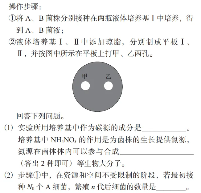 (2) 步骤①中,在资源和空间不受限制的阶段,若最初接种 N0 个 A 细菌,繁殖 n 代后细菌的数量是_______________。