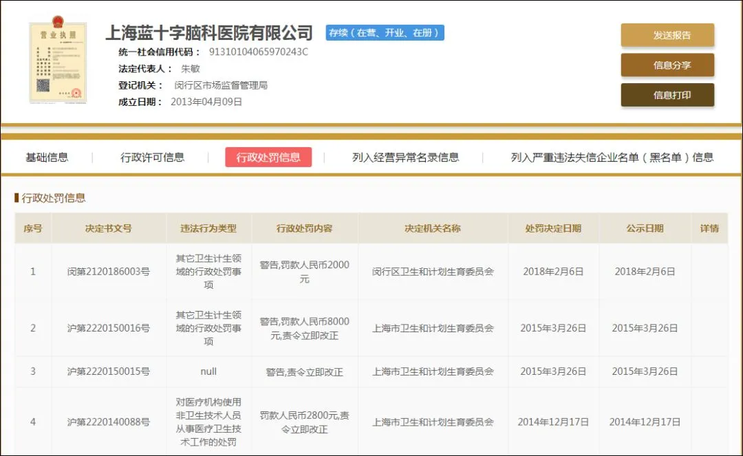 此外,在国家企业信息系统网站上,小编还查询到,该医院曾多次因对医疗机构使用非卫生技术人员从事医疗卫生技术工作等原因,而被予以行政处罚。