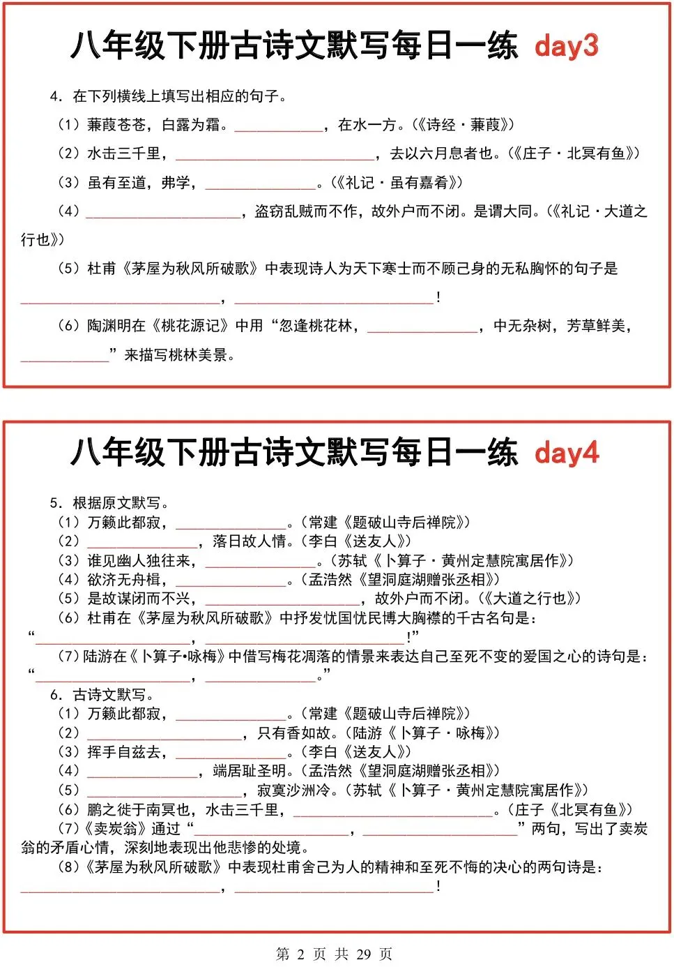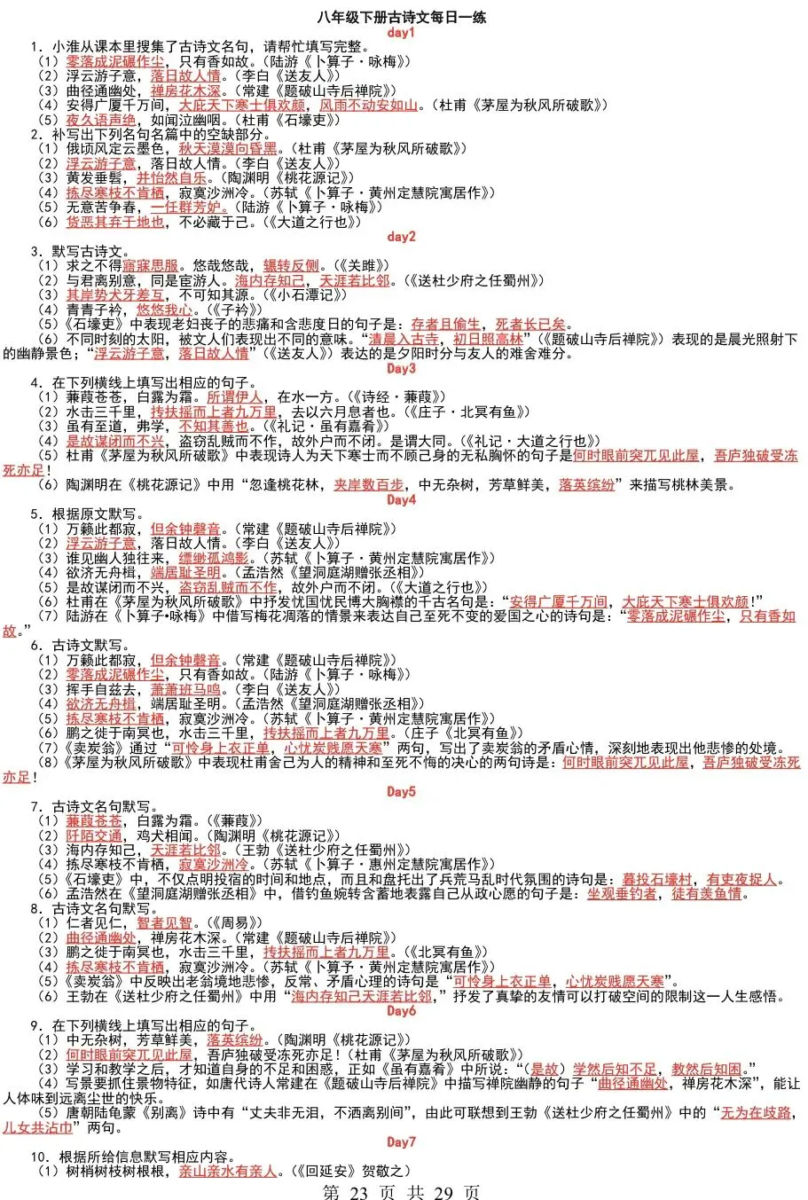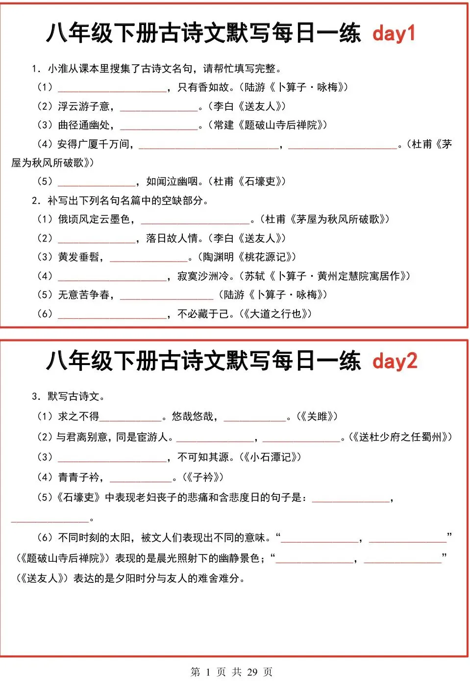 八下语文|古诗文每日一练:默写+答案(可打印) 今天为大家分享 【八下语文古诗文每日一练30天】 电子版下载: https://pan.baidu.com/s/15jSSLWqFbyeGh4Csojgd6Q?pwd=vo65 复制这段内容打开「百度网盘APP 即可获取」 想获取更多相关资料请关注下方公众号名片: 如果你觉得我的分享对您有所帮助,请帮忙多多点赞转发,能够让更多人知道,那将是我持续更新下去的动力,感恩! 本账号所分享内容均来自网络整理,如有侵权请联系删除,谢谢!