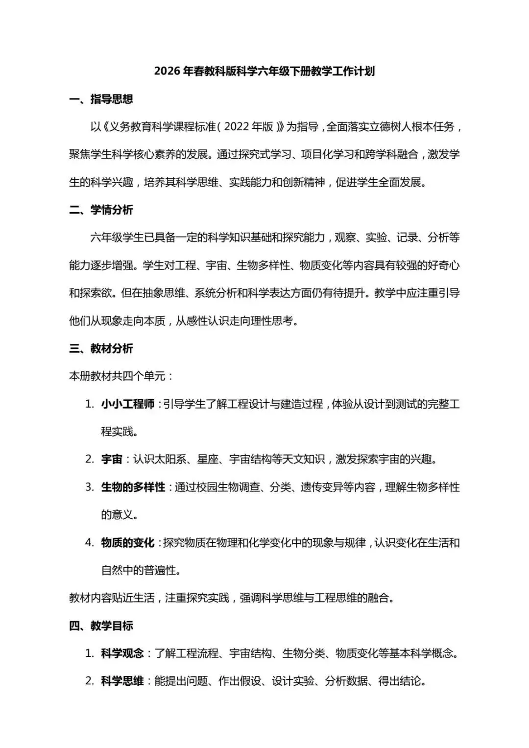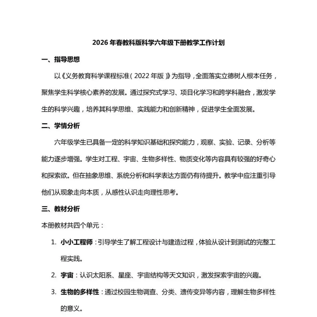 大家好,今天为大家分享一份精心准备的2026年春教科版科学六年级下册教学计划,旨在帮助各位科学教师高效开展新学期的教学工作。这份资料全面系统,是您新学期备课的得力助手。