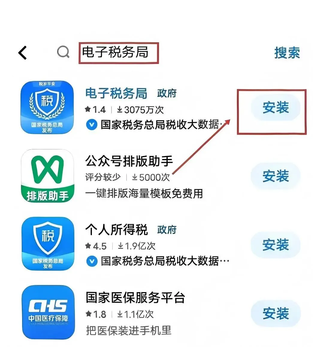 各手机应用商店搜索“电子税务局”APP,下载并安装