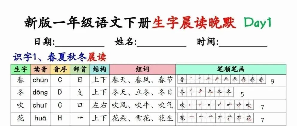 一年级下册:全册生字晨读晚默练习 -