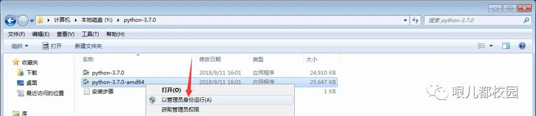2.打开“python-3.7.0”文件夹,鼠标右击“python-3.7.0-amd64.exe”(32位电脑操作系统鼠标右击“python-3.7.0.exe”),选择“以管理员身份运行”