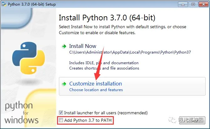 3.将“Add Python 3.7 to PATH”前面的复选框挑勾,然后点击“Customize installation”