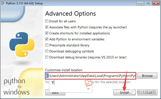 5.选择安装路径,默认安装在 C:\Users\Administrator\AppData\Local\Programs\Python\Python37(建议安装在除C盘以外的磁盘上,可以直接将C改成Y,安装到Y盘),然后点击“Install”