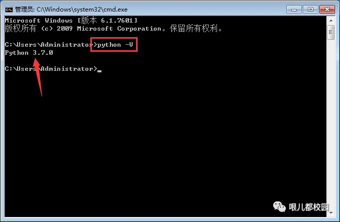 10.在弹出的DOS命令窗口中输入“python -V”命令,然后敲击“回车”键,会打印出当前Python的版本信息,这就说明Python安装成功