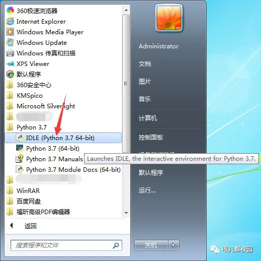 11.点击左下角(开始)菜单栏,进入所有程序,打开“Python 3.7”文件夹,鼠标左键单击“IDLE (Python 3.7 64-bit)”打开软件