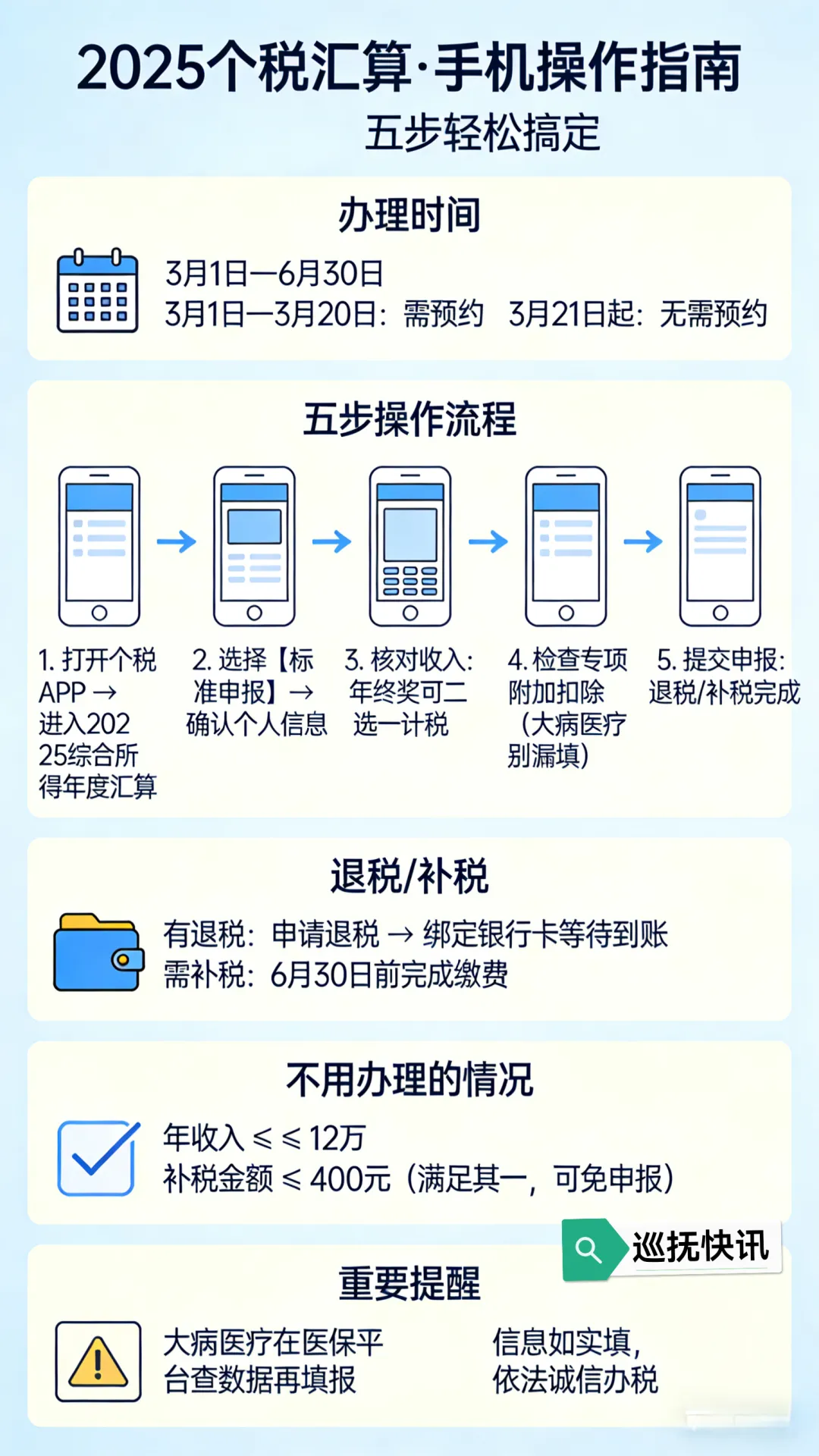2. 无需办理情形:年度综合所得收入≤12万元,或补税金额≤400元的,可免予办理汇算。