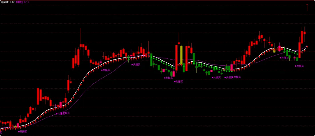 DRAWTEXT(黄金买点, LOW*0.98, ‘★共振买’), COLORFF00FF;