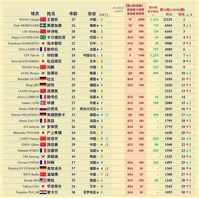 北京时间3月2日,新加坡大满贯积分结算,国际乒联2026年第10周世界排名随之更新结果发布!