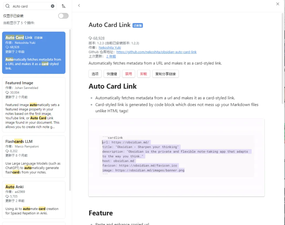 github的地址分享:https://github.com/nekoshita/obsidian-auto-card-link