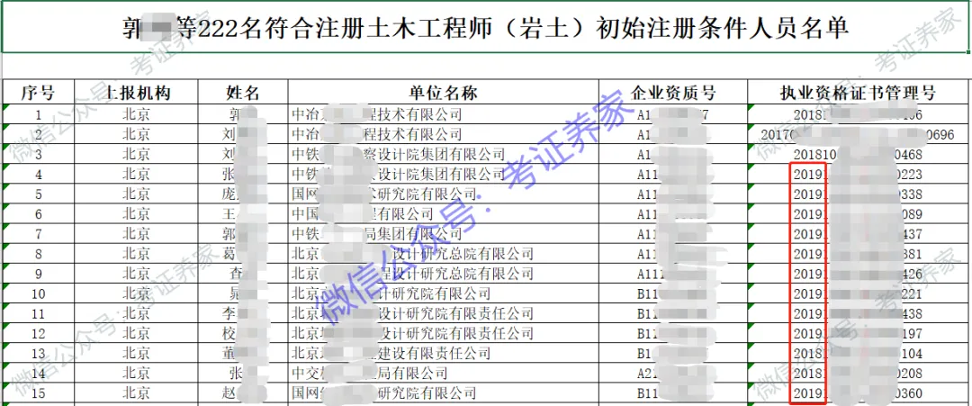 “执业资格证书管理号”那一列开始前四位,绝大部分是2019,代表这批证书是2019年考试通过的。
