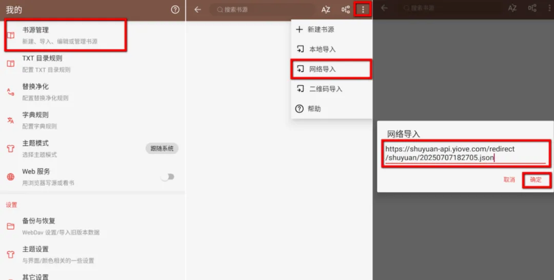 【我的】→【书源管理】→ 右上角三个点 →【网络导入】→ 输入书源链接 →【确定】